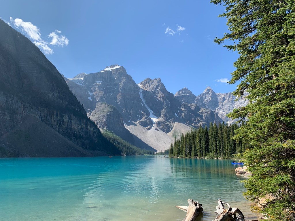 Thankfully we were able to see Moraine Lake, and it was beautiful. There is an easy path around the side of the lake where there weren’t so many people. The scenery is spectacular, and it’s worth a visit. Sadly, that means you have to drive to Lake Louise and out when it’s in the middle of high season.