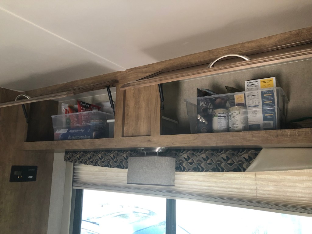 Other, non-refrigerated food went into plastic bins over the table. This is not a great arrangement, but it’s what’s available. I have to remember; it’s a motorhome, not a permanent residence.