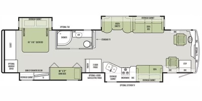 This motorhome has a great layout! There is tons of seating with a 3 seater pullout couch, a 2 seater jack knife couch, a bench dinette and the 2 captains chairs. There is a queen bed in the back with the bunks just past the kitchen.